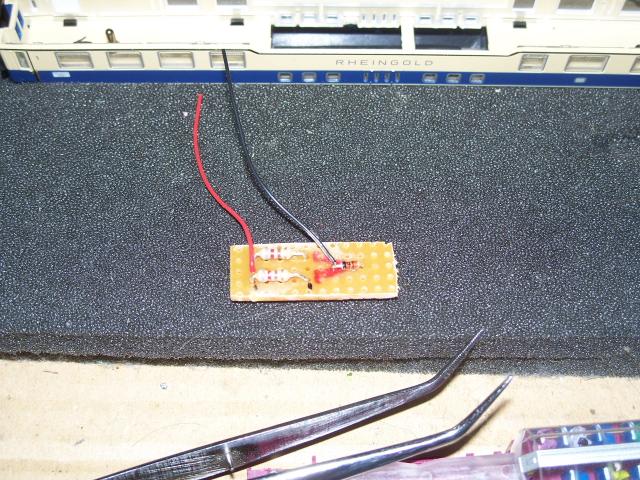 Die Lösung ist im Prinzip recht Einfach, 2 SMD LED m. Kabel (warm/weiß), 2 Vorwiederstände, 1 Schutzdiode und ein kleines Stück Lochrasterplatine.