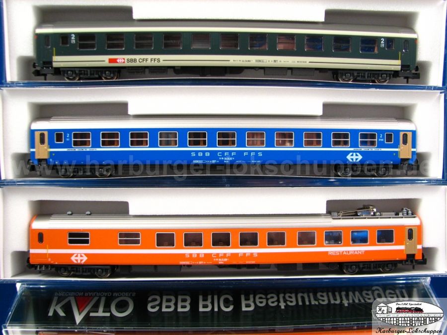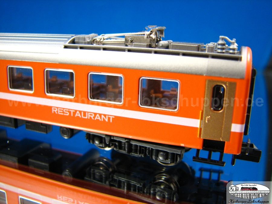 1. Kato SBB RIC Wagenset Arlberg-Express Artikel: K23000 alle Wagen sind mit LED Innenbeleuchtung ausgestattet, der Restaurantwagen mit Tischläpchenbeleuchtung.