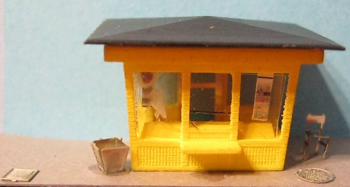 Eine Fernsprechbude mit beweglicher Tür. Die habe ich in N und TT geätzt, aber erst nur das TT-Modell zufammengelötet, daher ist sie auf dem Bild etwas groß geraten.