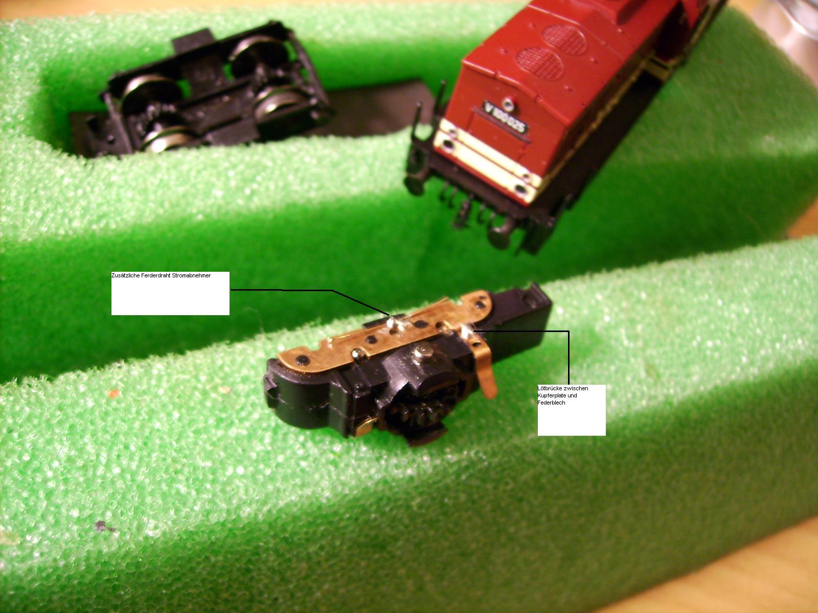 meine 201 hatte auch die Stromabnahmeprobleme und ich habe es ähnlich wie Du gelöst. ( http://www.raimonds-moba.de/modellbahn/basteleien/br201_stromaufnahme.htm ). Nur sollte man beim löten die Plätchen vom Drehgestell abmachen, denn die Drehgestelle können absolut keine Wärme vertragen. Ich mußte mir ein neues besorgen, denn dieses hatte sich, trotz sehr kurzer Lötzeit, verzogen.
