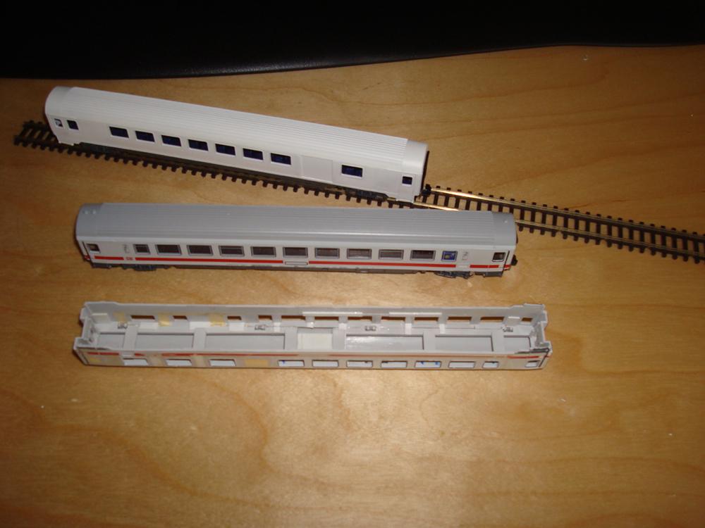 Andere Frage: Wer würde die Dächer meiner DB Interrregio (EP V) und IC Wagen (EP V) hellgrau lackieren ? Trix und GFN lieferten diese alle mit weissen Dächern aus. Beim Vorbild wurden dieses Farbschema recht schnell überarbeitet.