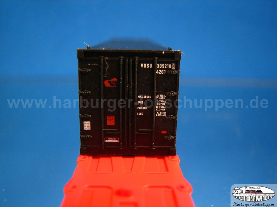 Auch der neu gelieferte 40' Container der Vos Logistics (824401) überzeugt mich überhaupt nicht. Die uralte Form zeigt einen genieteten Container, wie sie "in echt" seit Jahrzehnten nicht mehr gebaut werden. Meine letzte Sichtung eines solchen Container ist so lange her, dass ich mich gar nicht erinnern kann.