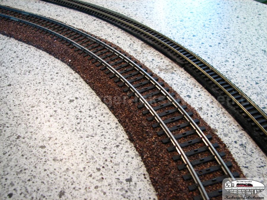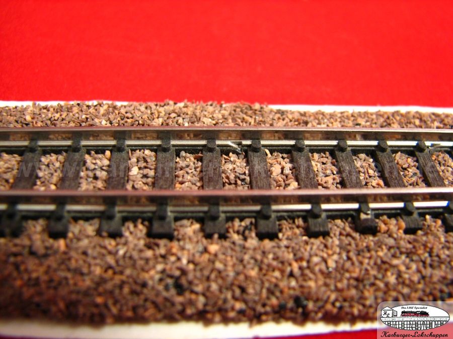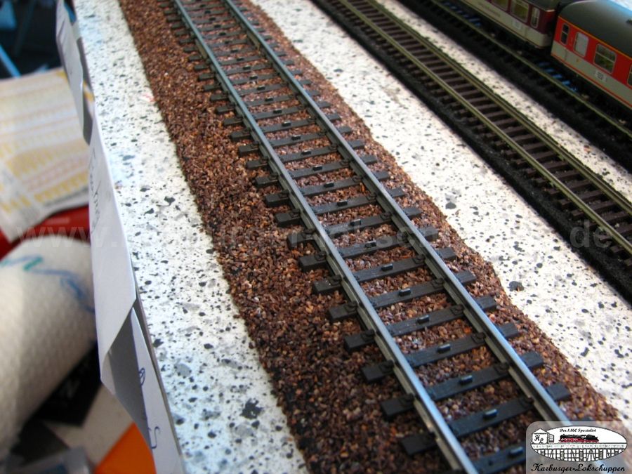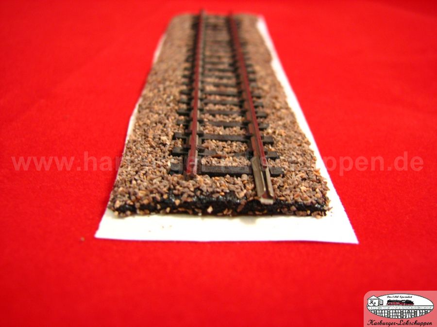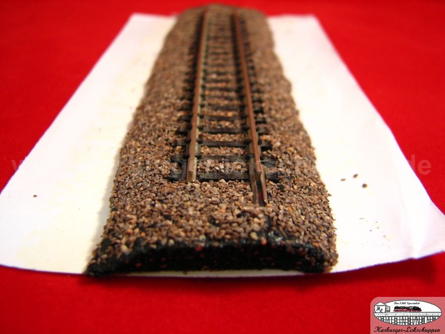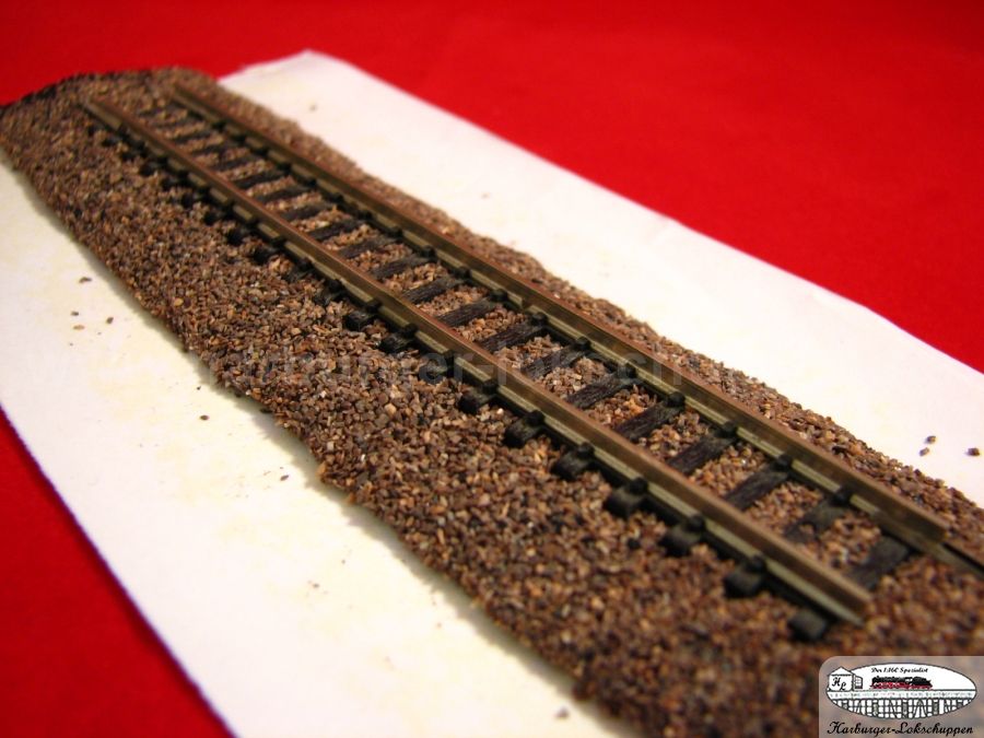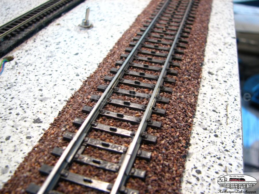 Der riesige Vorteil..so sauber und schnell, Schotter ich kein anderes Gleis so toll Schwellenoberkantig ein. Im Weichenbereich unter dem Stellweg, das Material nur darunter weg nehmen. Aber auch da ist der Super Vorteil, die Gefahr ist geringer ,des nicht versauen von Weichenkontakten, durch Kleber.