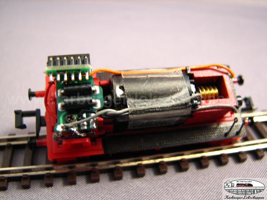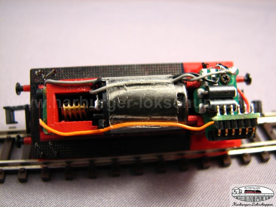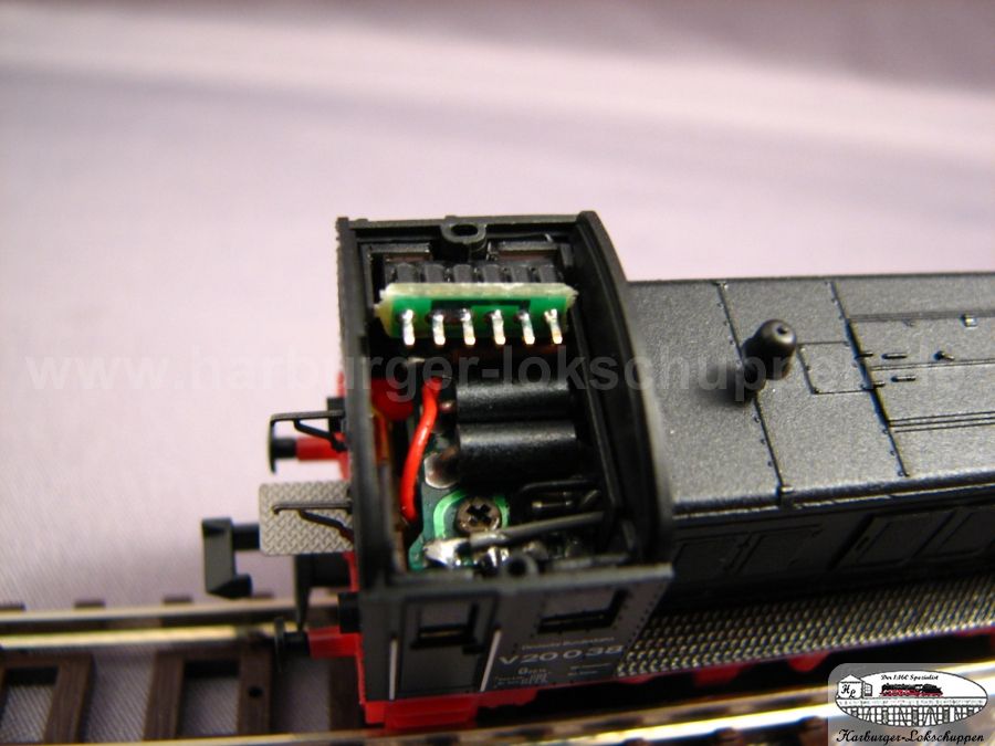 Dazu bitte einfach nur das Dach abnehmen, und da liegt die Schnittstelle frei. Wir haben einen Uhlenbrock Decoder eingesteckt. Dieser muss dann mit seinen beinchen, etwas umgebogen werden. Auch im Digital Betrieb....Sahne Fahrverhalten.