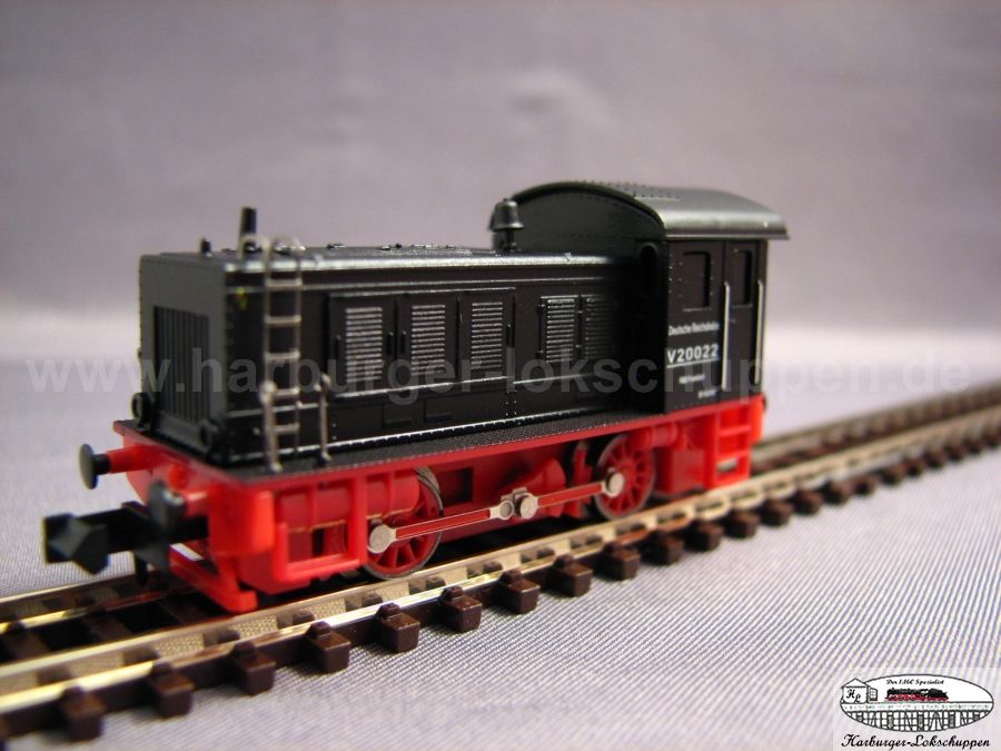 Die V20 022 wurde von der Fa. Jung erst 1941 hergestellt und mit der Bezeichnung WR200B14 und der Betriebs-Nr. 9585 am 28.07.1942 an die OKH Heeres-Verpfl.Amt Darmstadt geliefert. Die ehemalige DRG (Deutsche Reichsbahn-Gesellschaft) wurde bereits nach der Machtergreifung aufgelöst und existierte zum Auslieferungstermin der V 20 022  schon lange nicht mehr. DIe Auslieferung erfolgte in grau bzw. dunkelolivgrün. Erst am 06.11.1946 wurde die WR200B14 9585 von der RBD Frankfurt übernommen, als V 20 022 umgezeichet und stand weiterhin in der ursprünglichen Farbgebung im Einsatz. Erst ab 1949 wurden wurden die V20 und V36 nach und nach mit dem neuen Regelanstrich entsprechend der Zeichnung M11.14 vom 28.06.1949 versehen.