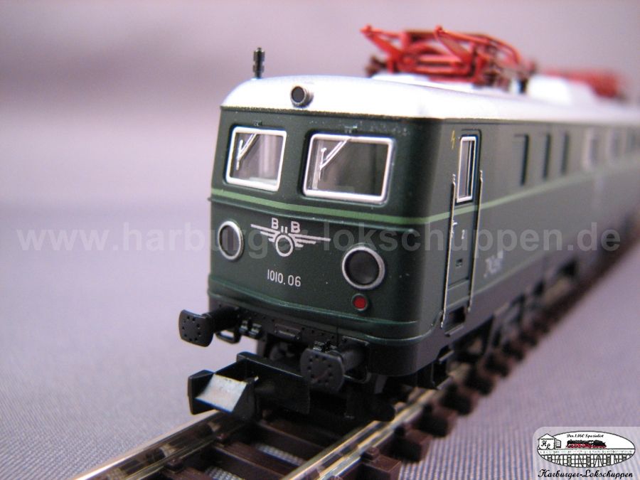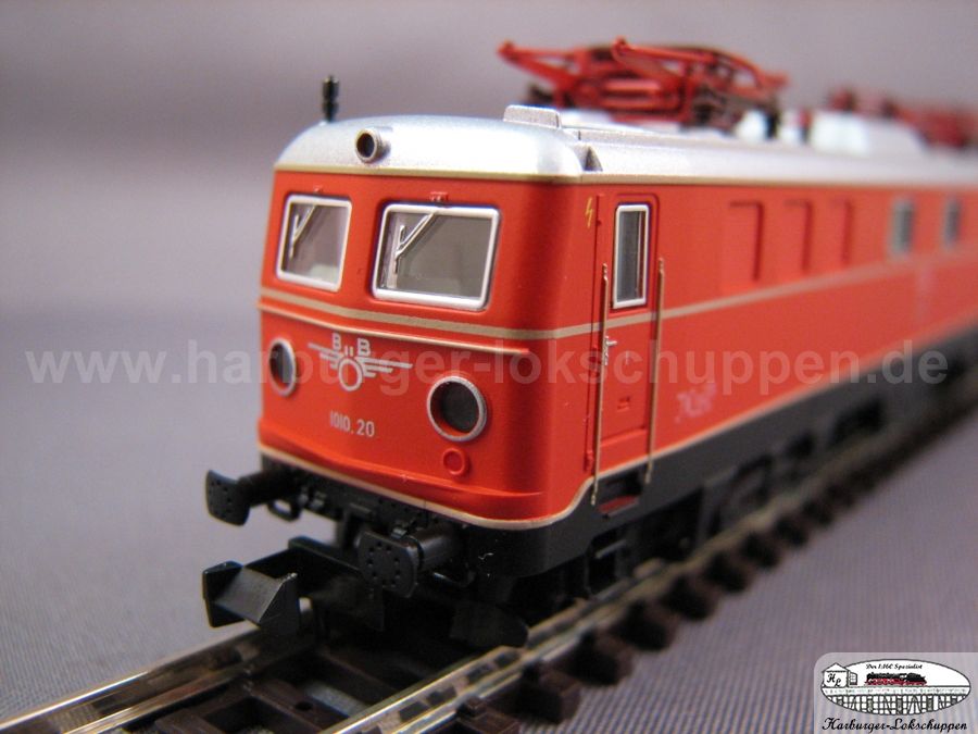 Allerdings kann man Fleischmann nicht viel außer der idiotischen Abkündigungspolitik mit irreführenden Fotomontagen vorwerfen. Im ursprünglichen Neuheitenfolder ist das Vorbild der blutorangen Lok abgebildet: die 1010.20 mit silbernen Fenstereinfassungen, Flügelrad und flachen Scheinwerfern - aber schon mit durchgehendem Schienenräumer.