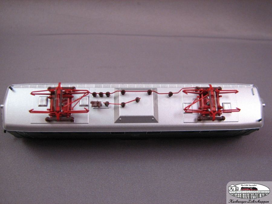 Der Stromabnemer soll die Ursprungsausführung Type IV darstellen. Beim tannengrünen geht das OK. Ich finde aber, beim blutorangen Modell müssten schon Wanisch Wippen drauf sein.
