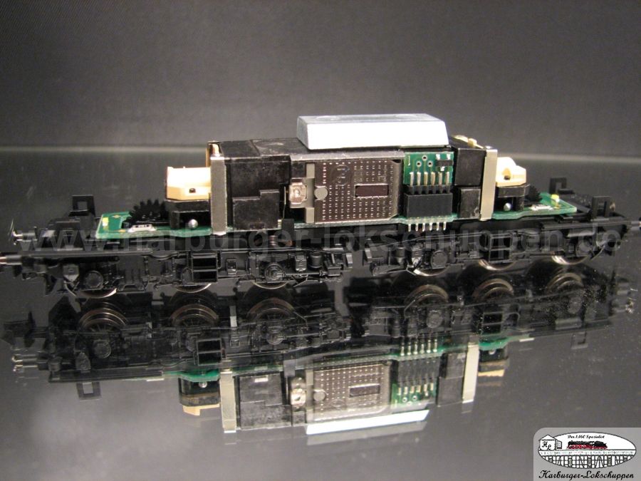 Eine Möglichkeit, der Lok mehr Gewicht zu geben liegt m.E. in den Drehgestellen: Hier ist sehr viel Hohlraum vorhanden, den man in mühseliger Kleinarbeit mit Gewichten auffüllen könnte. Da sind sicher einige Gramm zu verstecken.