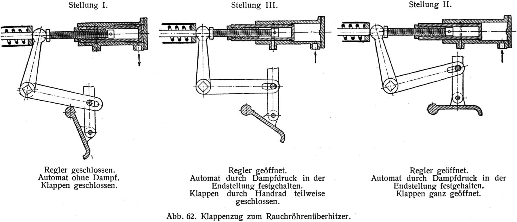 "Über die erweiterten Röhren ist in der Rauchkammer ein Kasten mit Klappen in der Stirnwand eingebaut (Abb. 61 b). Durch mehr oder weniger Öffnen der Kappen kann der Zug der Feuergase durch die erweiterten Rauchröhren und hierdurch die Höhe der Überhitzung geregelt werden. Bei abgestelltem Regulator sind die Klappen durch ihr Eigen- oder Gegengewicht (auch Federn) geschlossen. Mit ihnen ist durch Hebel und Zugstange der Kolben eines kleinen Dampfzylinders (Automat) verbunden (Abb. 62), der bei geöffnetem Regulator Dampf erhält und durch den Kolben und die Hebel die Klappen mehr oder weniger öffnet und hierdurch die Überhitzung der geforderten Leistung der Lokomotive entsprechend regelt. Unabhängig von dem Automaten kann der Führer von seinem Stand aus mittels Handrads und Schraube die Klappen einstellen und so die Überhitzung regeln. Vielfach erfolgt die Regelung der Klappen nur durch den Führer von Hand. Für Lokomotiven, deren Zugbelastungen weniger schwanken, hat man die Klappen fortgelassen, nachdem durch Versuche festgestellt ist, daß hierdurch Nachteile, namentlich ein Verbrennen der Überhitzerrohre, nicht zu befürchten ist."