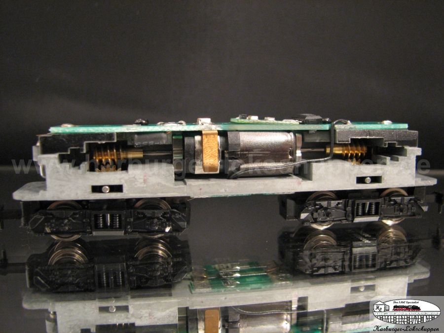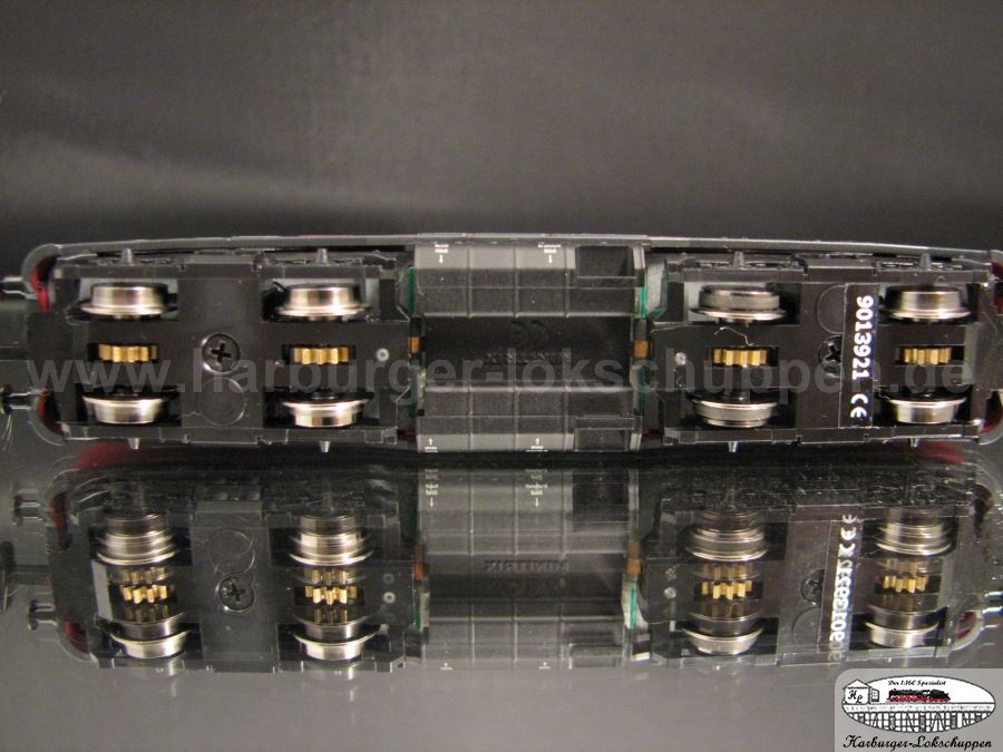 Interessant an der neuen Lok ist übrigens, dass Trix nun offenbar am liebsten nur noch Messingzahnräder verwendet, auch bei den Schneckenrädern. Was mit der Paarung Messingschecke und Messing- schnekcenrad passiert, kann man sich in zahlreichen alten Arnold- Loks ja ganz gut anschauen: Die beiden Bauteile zerfressen sich gerne gegenseitig. Nachdem Trix erst erfolgreich den alten Roco- und Arnold-Fehler mit auf die Radsatzwellen aufgepressten Kunststoffritzeln, die dann platzen, wiederholt hat, zaubert man nun dieses alte Kaninchen aus dem Hut...