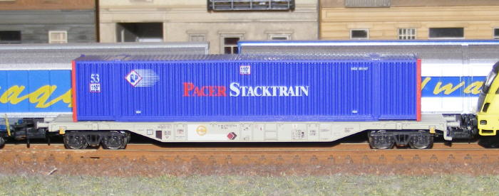 Die 53-Fuß-Kisten sind mit ihren gut 16m Vorbildlänge viel zu groß für einen kontinentaleuropäischen Straßentransport, dank ihrer Zapfen lassen sie sich aber auf den langen Tragwagen von Trix verladen.