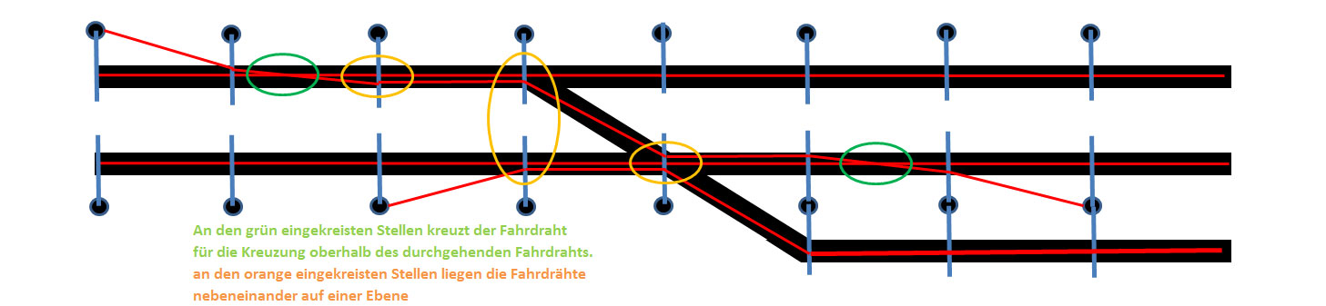 an Kreuzungsweichen werden die Fahrdrähte NICHT einfach gekreuzt. Es kommt eine sogenannte Fahrleitungsspinne zum Einsatz,