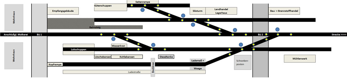 ich habe mal die von mir vorgesehenen Standorte der der Weichensignale als blaue Punkte in den Spurplan meines Bahnhofsmoduls eingezeichnet: