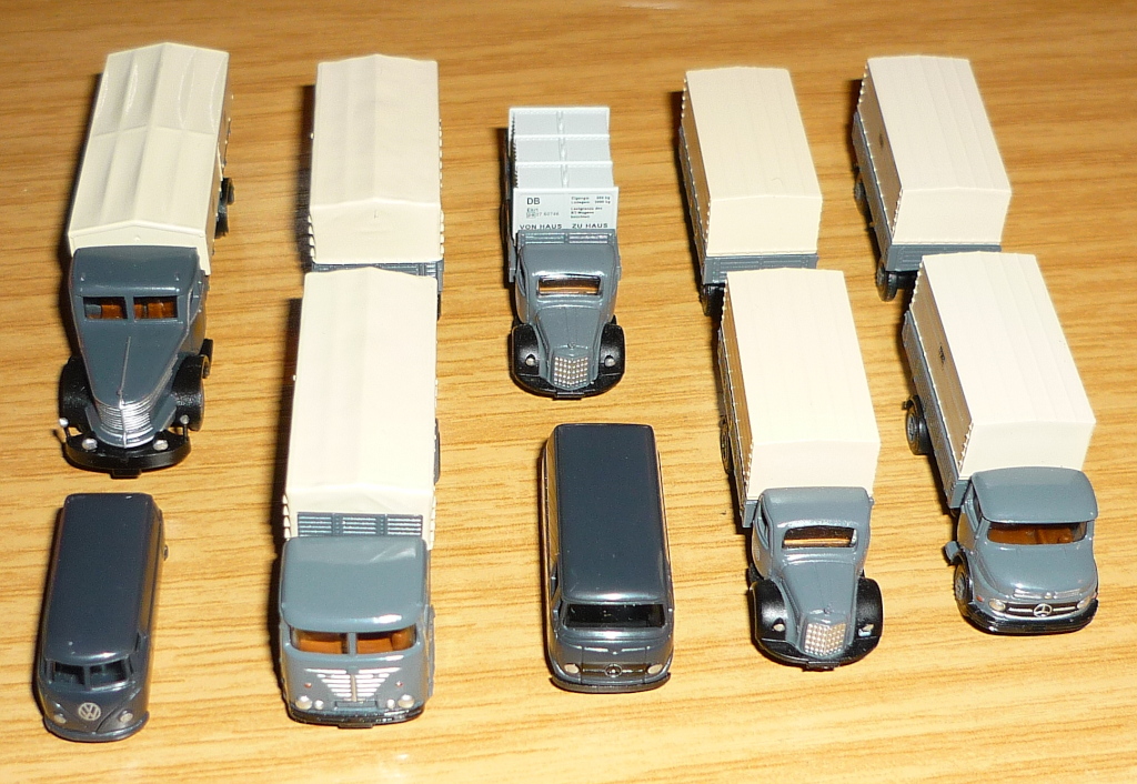 das wird Dir wohl keiner genau sagen können. Auch der Link von Werni zeigt nur ganz wenige Orginalfahrzeuge, die die Deutsche Bundesbahn mal hatte. Die Gummieisenbahn war halt noch nie so ein Sammelthema . Was die 160er Modelle angeht, hat Rietze eigentlich erst mit den VW T1 und MB L309 DB Modellen angefangen. Da gibt es 3 Packungen und dann natürlich die Lemke miNis aus der jüngsten Zeit. Vom Wiking Bahnbus, den Werni beschreibt, gibt es 3 Beschriftungsvarianten, einer als Ladegut bei GLN, einer vom BahnShop und einer beim FCS.