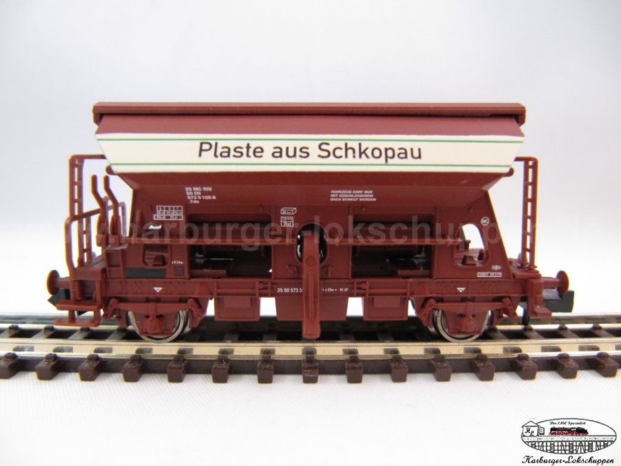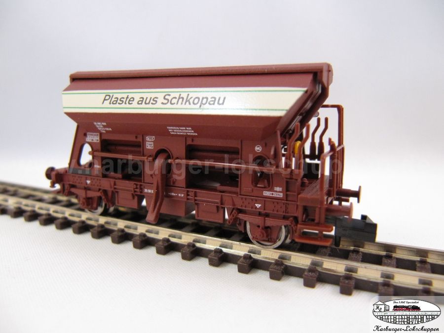 Der Schotterwagen 851002 DR Plaste aus Schopkau hat keine schwarzen Puffer, die braune durchgefärbte Bodenplatte incl. der Puffern sieht echt besch... aus!!! Da sind die Arnold-Schotterwagen für wesentlich weniger Euros doch echte Sahne! Auf den Sonderdruck Plaste aus Schopkau kann ich dann gerne verzichten!