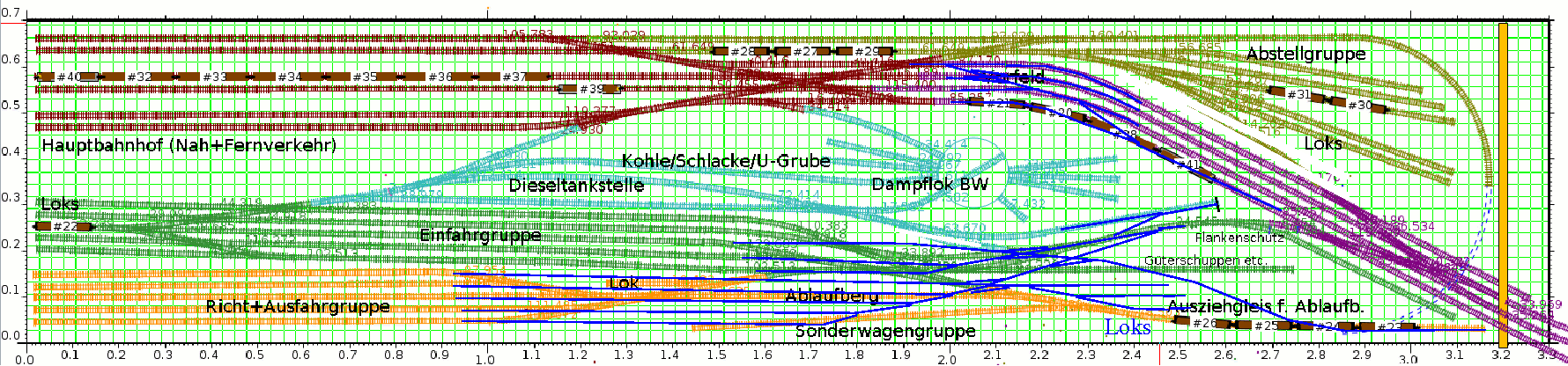 - Orange: 5gleisige Richt+Ausfahrgruppe (liegt in einem leichten Gefälle). Kleines Lok-Wartegleis für Lok zum Nachdrücken von liegengebliebenen Wagen). Ablaufberg. Eingleisige Sonderwagengruppe, für Wagen die nicht abgerollt werden dürfen. Ziehgleis für Ablaufberg, kann min. die Hälfte des längsten Güterzuges + Rangierlok aufnehmen.