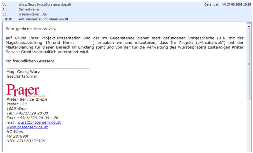 Das "Wohlwollen" steht auch in der dann offensichtlich gefälschten Mail vom Praterverband in Münchhausens "Businessplan"! Warum soll es dort plötzlich einen so krassen Sinneswandel gegeben haben? Aufdeckung Vavras als Scharlatan und Pleitier?