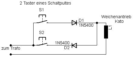 Wenn man es andersrum schaltet, also mit zwei Dioden sich aus dem Wechselstrom duch Halbwellengleichrichtung je eine positive und eine negative "Schiene" macht, dann kann man mit je zwei Tastern gegen + und - so viele Weichen Schalten wie man möchte, alles mit total 2 Dioden. Oder anstatt Trafo und Dioden gleich zwei blllige Schatnetzteile mit je 12V (aus der Bastelkiste) zusammenschalten und damit +/- 12V erzeugen.
