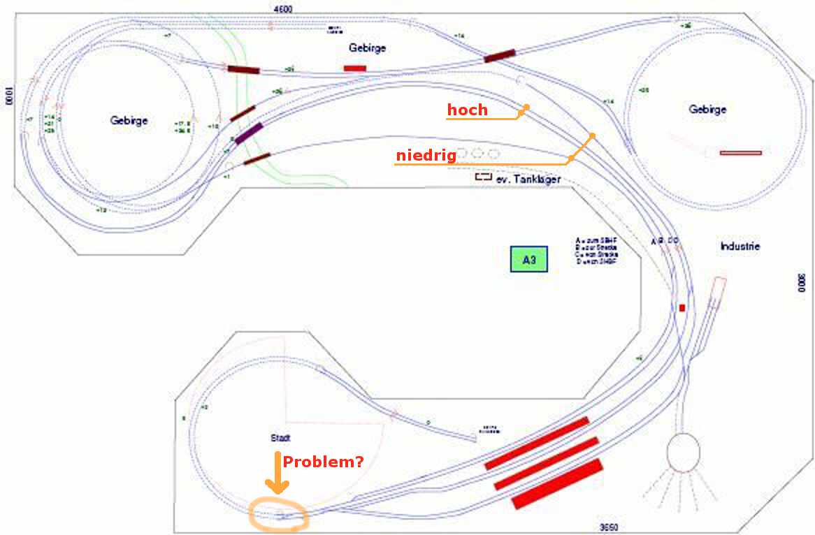 + Im Bahnhof dann Verwendung der 15°-Weichen (wenn die weiterverwendet werden sollen) mit entsprechendem Gleisabstand. Hier würde ich darauf achten, dass es "durchgehende Hauptgleise" durch den Bahnhof gibt, die möglichst durch keine der engen Weichen krumm durchgehen.