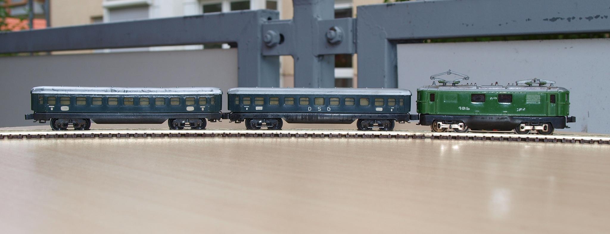 das ist ja ein echter Sensationsfund. Weder Lok noch Wagen sind m.W. so ausgeliefert worden, das dürften Einzelstücke / Handmuster sein. Die Re 4/4 war noch auf das Fahrwerk der Ur-V200 konstruiert, kam aber erst 1963 mit Normkupplung ins Programm. In alten MIBA's (Messeberichte 1961 / 1962) findet man noch andere Handmuster (E 10 und eine V 80 ähnliche Diesellok) auf Ur-V200 Fahrwerk, aber eine Re 4/4 nicht. Auch die Farbe der Wagen dürfte ein Unikat sein. Den DSG Wagen kennt man in rot, den Sitzwagen in grün und blau. Das "ozeanblau" hier war ja der Vorbildfarbgebung um mehr als 1 Jahrzehnt voraus