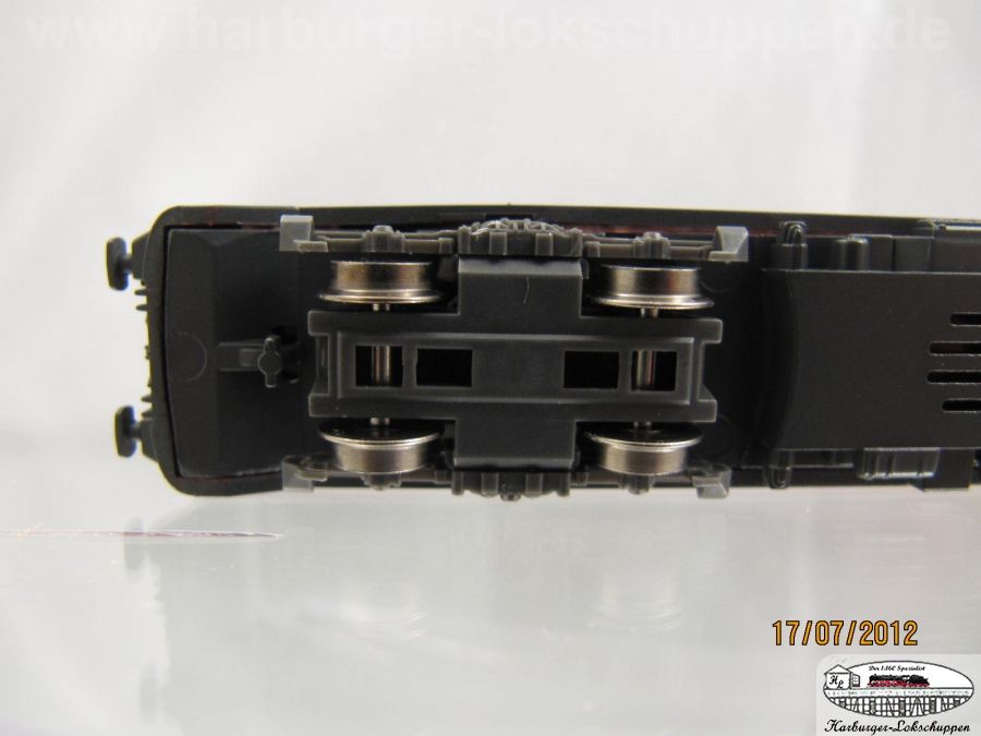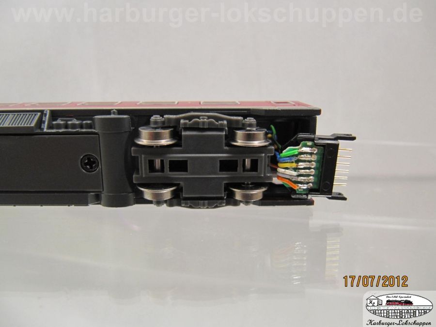 Zur Technik: Der motorisierte Wagen hat 8 (!) Haftreifen und keine Stromabnahme, die erfolgt ausschleißlich vom unmotorisierten Endwagen aus. Der Zug ist also nicht wendezugfähig und sollte wohl mit dem unmotorisierten Wagen voraus gefahren werden soll er Haltesignale korrekt beachten. Die Sound-Nachrüstung ist nur für den unmotorsierten Endwagen vorgesehen.