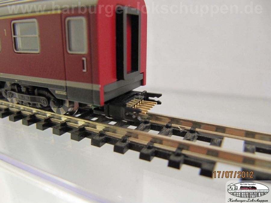 Der 624 mit Stromabnahme nur vom Steuerwagen ist doch im Grunde wie ein Wendezug z. B. aus Silberlingen und einer Lok. Wenn so ein Zug geschoben wird, bekommt die Lok auch nicht den Strom aus dem vorausfahrenden Steuerwagen. Ich habe damals allle Wendezug-Steuerwagen und auch viele Triebwagen mit Magneten unter dem Wagenboden ausgestattet, die vor einem Signal oder an einem Bahnsteig jeweils einen Reed-Kontakt betätigten. Dieser schaltete dann das ganze Gleis stromlos, und der Zug blieb stehen.