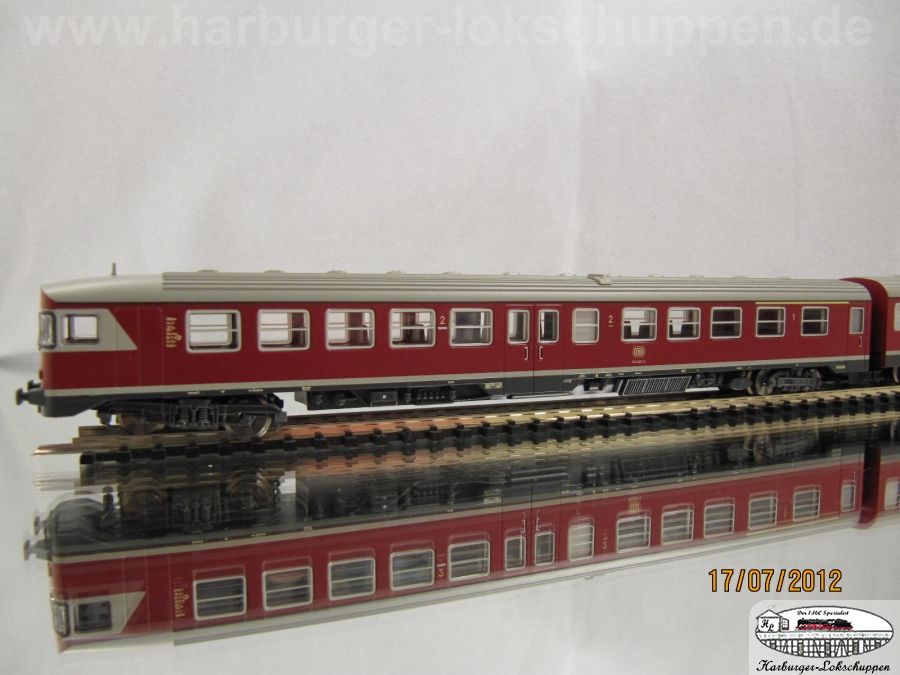 Ich habe heute meinen 624er vom Händler abholen können, digitalisiert und aufs Gleis gesetzt, und ich muß sagen, der Zug gefällt mir ausgesprochen gut. Die Innenbeleuchtung ist gleichmäßig und nicht zu hell, auch von der Lichtfarbe sehr angenehm. Spitzen- und Schlußlicht ebenfalls sehr gut ausgeführt. Die Fahreigenschaften sind hervorragend. Der Zug befährt problemlos alle Strecken, an denen der 612 und der 614 von Fleischmann regelmäßig entgleisen oder liegenbleiben oder beides.