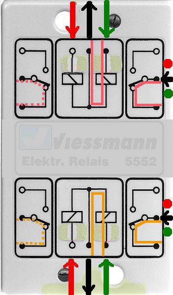 In diesem Dokument sieht man wie die Kontakte angeschlossen sind. Du brauchst die nur auf der Rückseite der Platine die "Verdrahtung" zu verfolgen und dann hast Du die Punkte welche was sind. Normalerweise ist das was Du da in der Zeichnung siehst die "Ausschaltung" ... also Relais ohne Strom. Das sollte dann Rot sein und die Schiene ohne Strom.