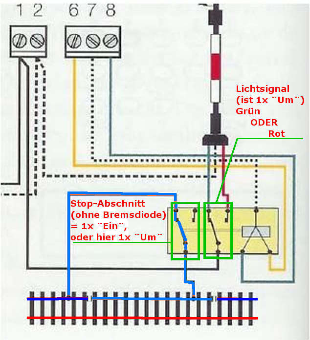Übrigens: Wenn du Lichtsignale verwendest, geht es auch ohne Relais. Es genügt, wenn die für die Lichtsignale verwendeten Kippschalter noch freie Umschaltkontakte haben.
