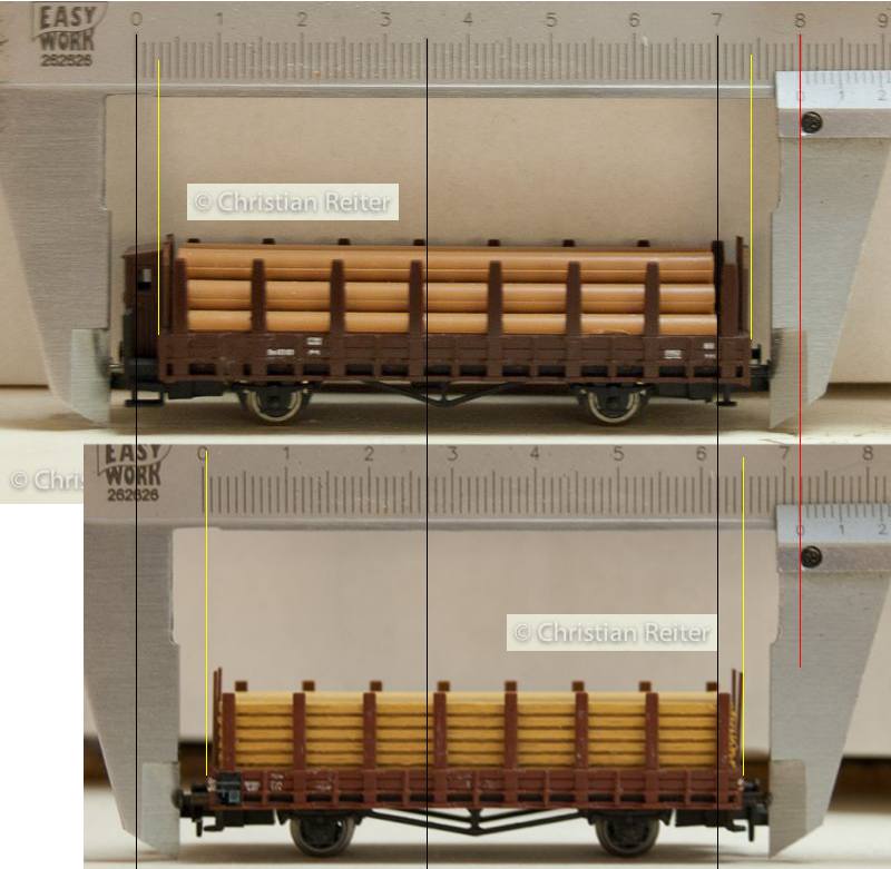 Der Roco-Wagen ist zu lang, vermutlich weil das Einheitsfahrgestell drunter passen musste (Kühlwagen, Viehwagen, für den Wagen mit Bremserhaus wurde dann aber doch ein neues Fahrwerk entwickelt). Mit maßstäblichen Puffern ist der Wagen ohne BH 78,5mm, der mit BH 82mm lang.