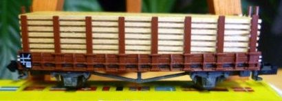 Ich wollte damals einen "stimmigen" Länderbahn-Rungenwagen mit spitzem Sprengwerk und 8 Rungen je Seite haben und bin letztendlich über diesen uralten Trix-Wagen gestolpert, der sich als  Rungenwagen der Verbandsbauart A 4 bzw. später als R Stuttgart, wie ich finde, ziemlich gut macht: