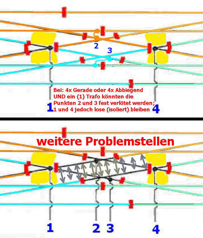Verstehe ich nicht! Sind doch 4 ganz normale Weichen mit einer ganz normalen Kreuzung, nur daß alles auf einen Schlag in der Maschine mit Schwellen verspritzt worden ist. Keine andere Geometrie und auch keine Besonderheiten bei Herzstücken oder anderen Kleinigkeiten. Ich kann also Deine Vermutung nicht nachvollziehen...