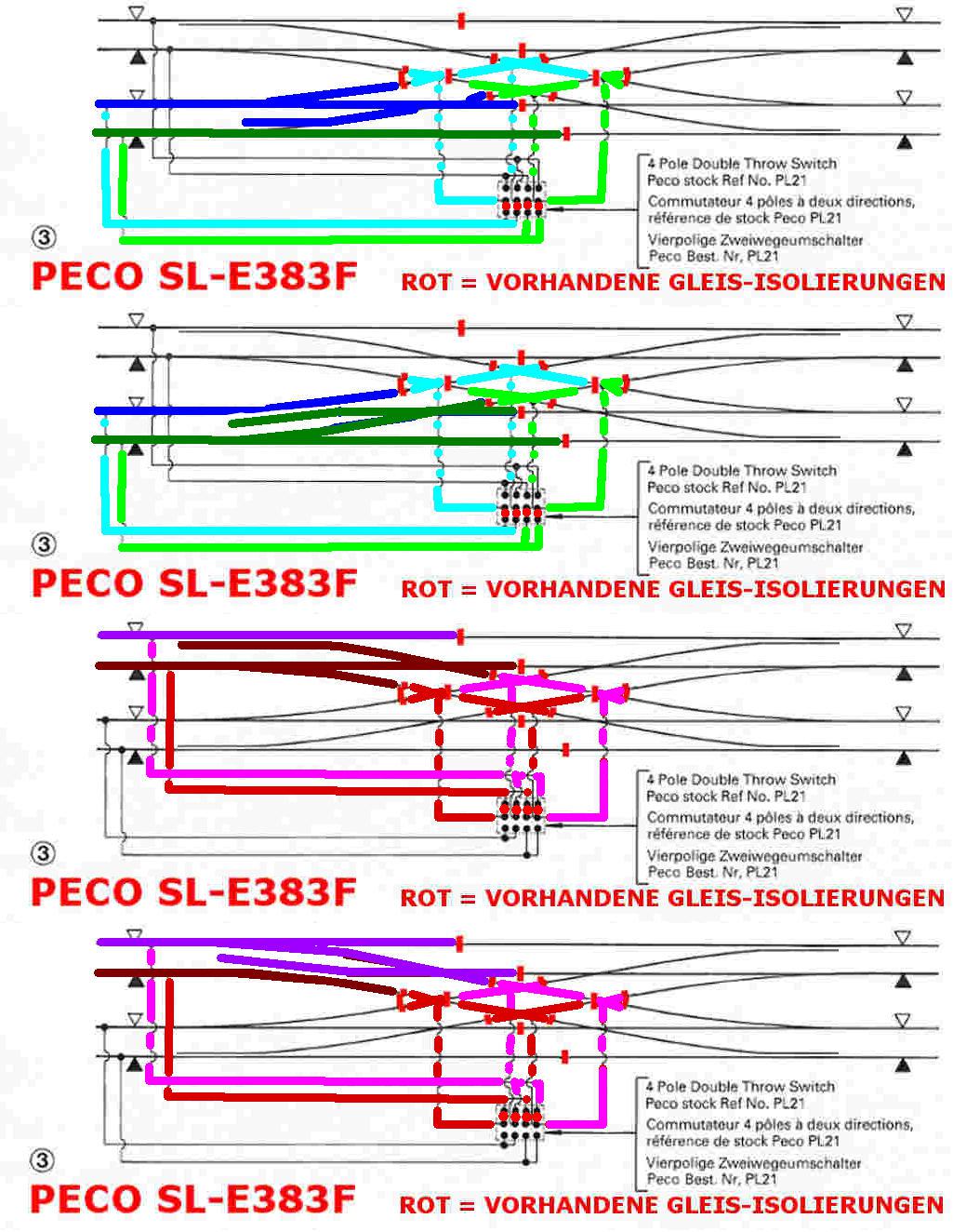 da ich jetzt Urlaub habe will ich mich endlich der Verkabelung der Peco Hosenträger in meinem Kopfbahnhof widmen.Berti hatte mir da schon eine Skizze incl.Relais geschickt-vielen Dank nochmal-jedoch glaube ich das es nicht für zwei getrennte Fahrstromkreise machbar ist,um z.B. im Gegenverkehr den HT zu befahren .Laut Peco-Zeichnung brauche ich nur einen 4poligen Zweiwegeumschalter.Genügt das wirklich? Und reichen dann die Weichenantriebe ohne Zusatzschalter aus? Fahre übrigens analog und kann nichts mit dieser in einschlägiger Broschüre gefundenen Nullleiter-Fahrschiene anfangen,da ich die ansteckbarenTitanfahrregler habe.
