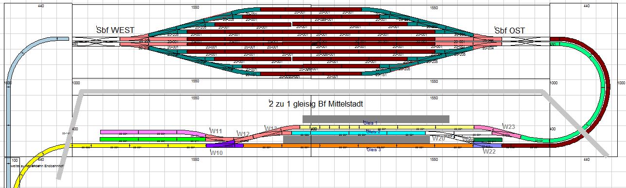 Die Weichen im Sbf habe ich auf jeweils 2 Bereiche eingeteilt. Während ein Zug (langsam fahrend) abbiegt um abgestellt zu werden, kann die hellrote Weiche früh wieder freigegeben werden und der nächste Zug zügig ;) durchfahren.