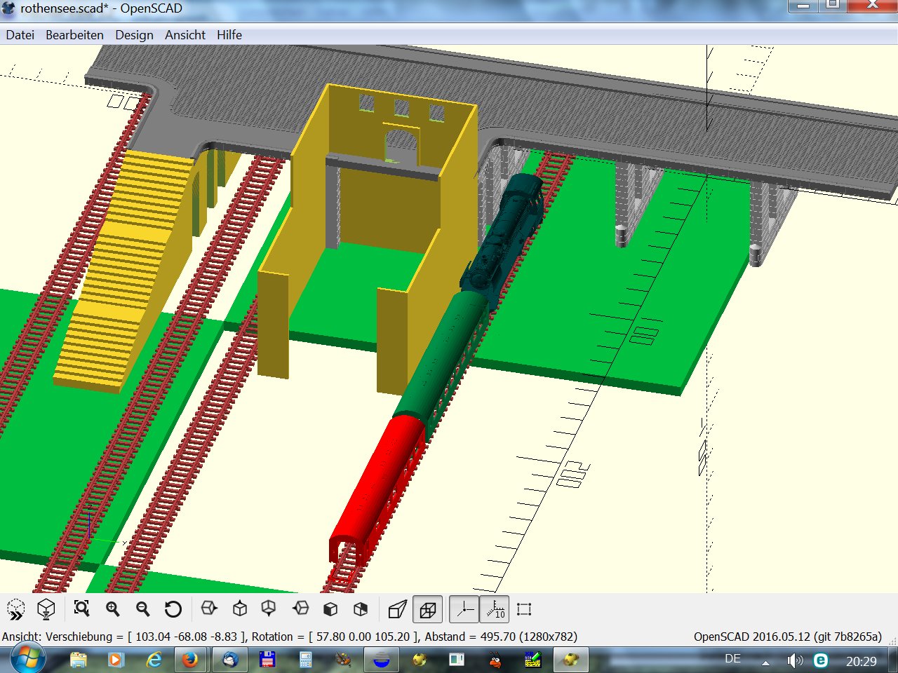 Die Grünen Felder sind 17x17cm Modulrasterquader, die grauen Teile der Brücke sind gezeichnet und Druckbereit, die Gleise und die Fahrzeuge sind 3D-Teile aus anderen Z-Projekten die ich hier nur zur Deko eingefügt habe. Das Haus und die gelben Brückenteile sowie die Brückenwiederlager müssen noch fertig gestaltet werden. Sie Fahrbaun der Brücke vor dem Haus ist ein 3D-Druckteil was alleine 4 Stunden den Rechner  je korektur beschäftigt hatt.